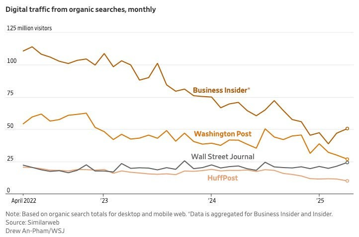 Traffic from conventional search to large media websites is having a tough go. The numbers tell a brutal story. HuffPost’s traffic from organic search has dropped by more than 50% in three years. Business Insider saw a 55% decline in the same period. The Atlantic’s CEO told employees to assume traffic from Google will eventually hit zero. How bad are things getting for publishers? Have a look at the image below if you don’t believe me.
